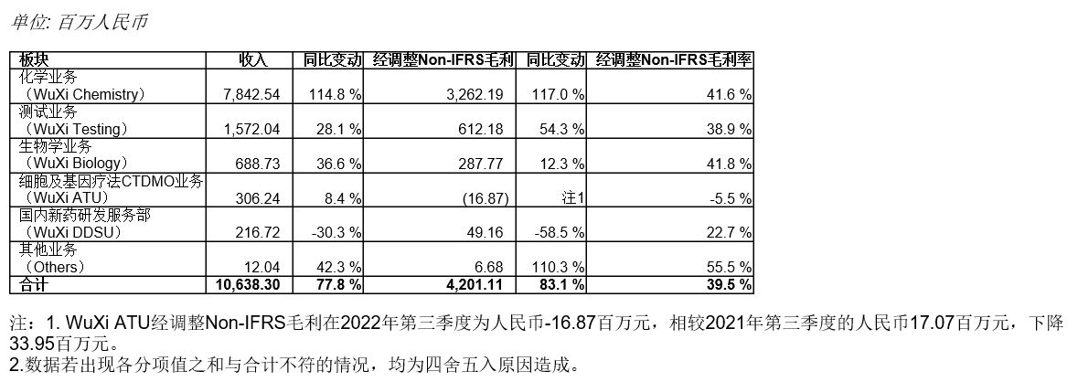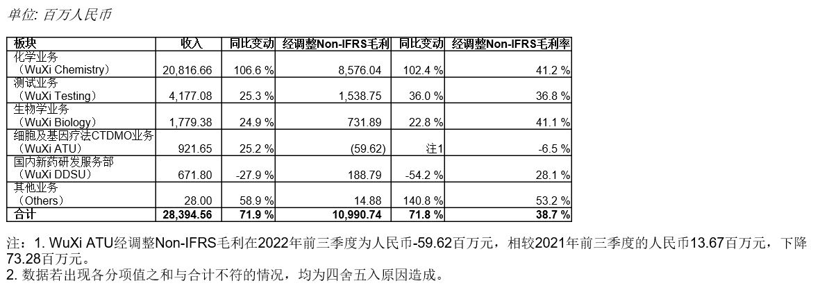 -生物学业务实现收入17.79亿元,同比增长24.9%,经调整Non-IFRS毛利7.32亿元,同比增长22.8%,毛利率为41.1%。虽然第二季度收入增长受到上海地区疫情影响,但是在广大员工共同努力下,第三季度业务得到恢复。