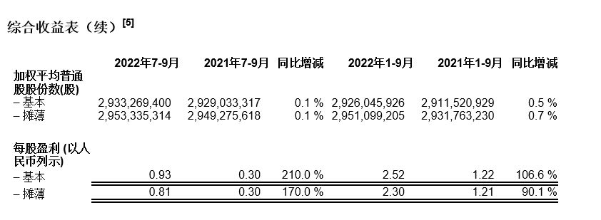 [1]2021年1-9月和2022年1-9月,公司稀释加权平均普通股股份数分别为2,931,763,230股和2,951,099,205股。