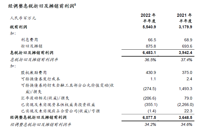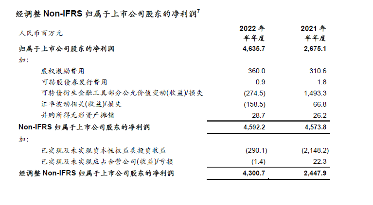 为补充本公司按照国际财务报告准则呈列的综合财务报表,本公司提供Non-IFRS毛利和Non-IFRS归属于上市公司股东的净利润(不包括股权激励计划开支、可转股债券发行成本、可转股债券衍生金融工具部分的公允价值变动损益、汇兑波动相关损益、并购所得无形资产摊销、商誉减值损失)、经调整Non-IFRS归属于上市公司股东的净利润(进一步剔除已实现及未实现公允价值变动收益、合营企业和联营企业已实现和未实现的资本性投资收益)、经调整Non-IFRS每股收益、息税折旧及摊销利润、经调整息税折旧及摊销利润作为额外的财务指标。这些指标并非国际财务报告准则所规定或根据国际财务报告准则编制。