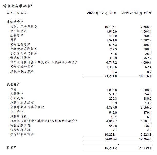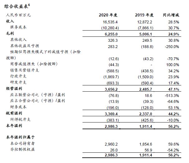 - 归属于上市公司股东的净利润29.60亿元,同比增长59.6%。2020年,因投资组合及联营企业损益变动合计实现净收益17.17亿元,主要由于投资组合中某些公司实现IPO而导致的股价上升;合营企业股权投资净亏损0.14亿元。2019年,因投资组合及联营企业损益变动合计产生净亏损1.07亿元,合营企业股权投资净亏损0.39亿元。