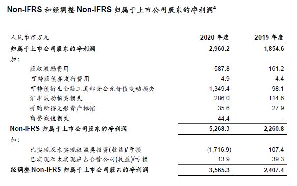 - 剔除来自于投资组合已实现和未实现的公允价值变动收益,以及合营企业和联营企业已实现及未实现的投资收益,2020年经调整Non-IFRS归属于上市公司股东的净利润增长48.1%至35.65亿元。